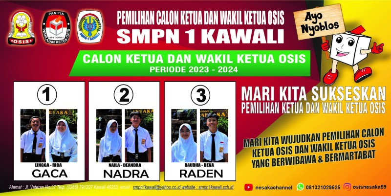 Pesta demokrasi di SMPN 1 Kawali akan segera dilaksanakan, ayo gunakan hak pilihmu untuk memilih calon-calon terbaik menurut hati nuranimu. Jangan lupa dicatat ya, kamis 18 Januari 2023 !!!