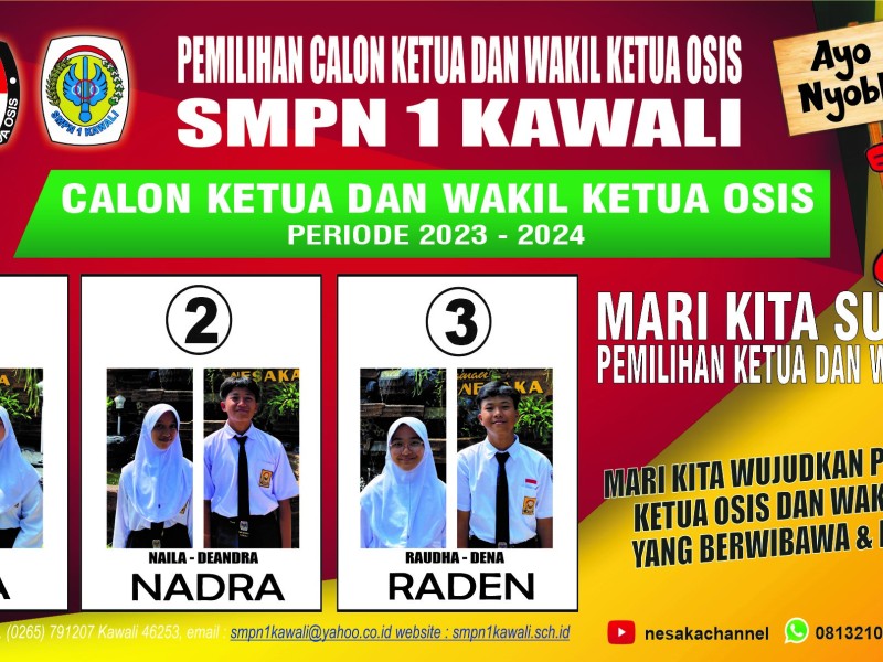 SelengkapnyaPesta demokrasi di SMPN 1 Kawali akan segera dilaksanakan, ayo gunakan hak pilihmu untuk memilih calon-calon terbaik menurut hati nuranimu. Jangan lupa dicatat ya, kamis 18 Januari 2023 !!!Ayo kita bangun negeri mulai dari OSIS di SMPN Kawali... Semangat...!!! ...
